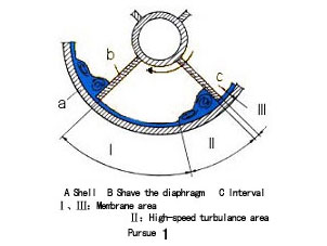 當(dāng)待處理物料進(jìn)入刮膜蒸發(fā)器后,先和轉(zhuǎn)子上的布料器相接觸,并被均勻地分配到內(nèi)筒壁,然后靠一組刮膜片加速并立即在加熱面上形成(0.5~3.5mm)的液膜;在每一組刮膜片前端(II區(qū))的流體形成一個(gè)渦流,在加熱面和葉片頂部之間間隙里的流體被高地湍動(dòng),并導(dǎo)致強(qiáng)烈傳熱和傳質(zhì),甚至高粘度產(chǎn)品在這湍動(dòng)下產(chǎn)生高的熱傳遞系數(shù)。